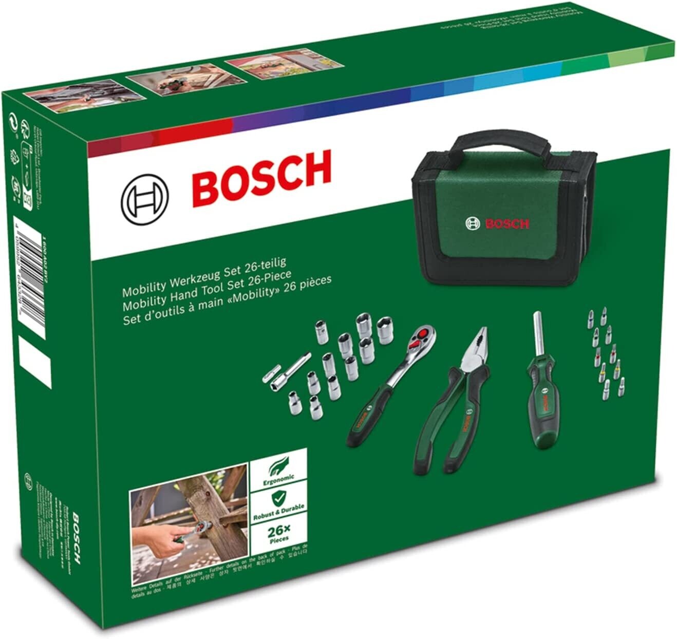 Bosch Home and Garden Mobility Juego de Herramientas Manuales, 26 Piezas Kit de Herramientas Compacto y Portátil para Tareas de Bricolaje, Carraca de 1/4', Alicate Combinado, Destornillador Universal