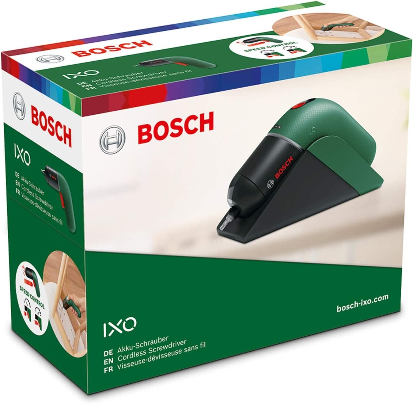 Bosch atornillador a batería IXO Set con estación de carga (6.ª generación, verde, CONTROL DE VELOCIDAD variable, recargable con la estación de carga y el cable micro-USB incluidos)