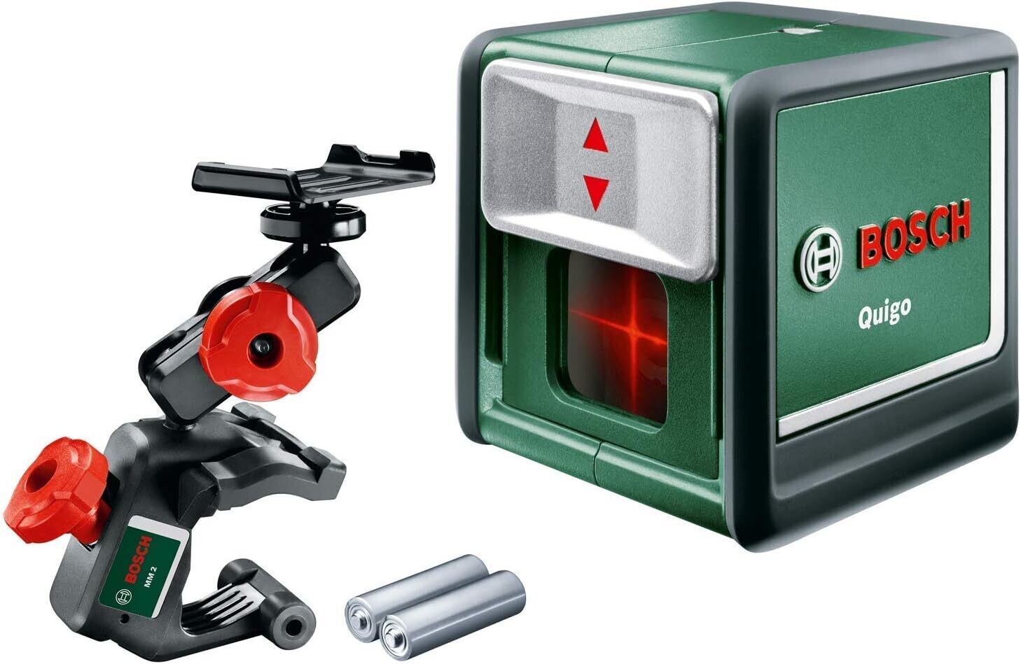Bosch nivel láser de líneas cruzadas Quigo con pinza universal MM 2 (alineación fácil y precisa con posicionamiento flexible de la herramienta) + Bosch bastón telescópico TP 320