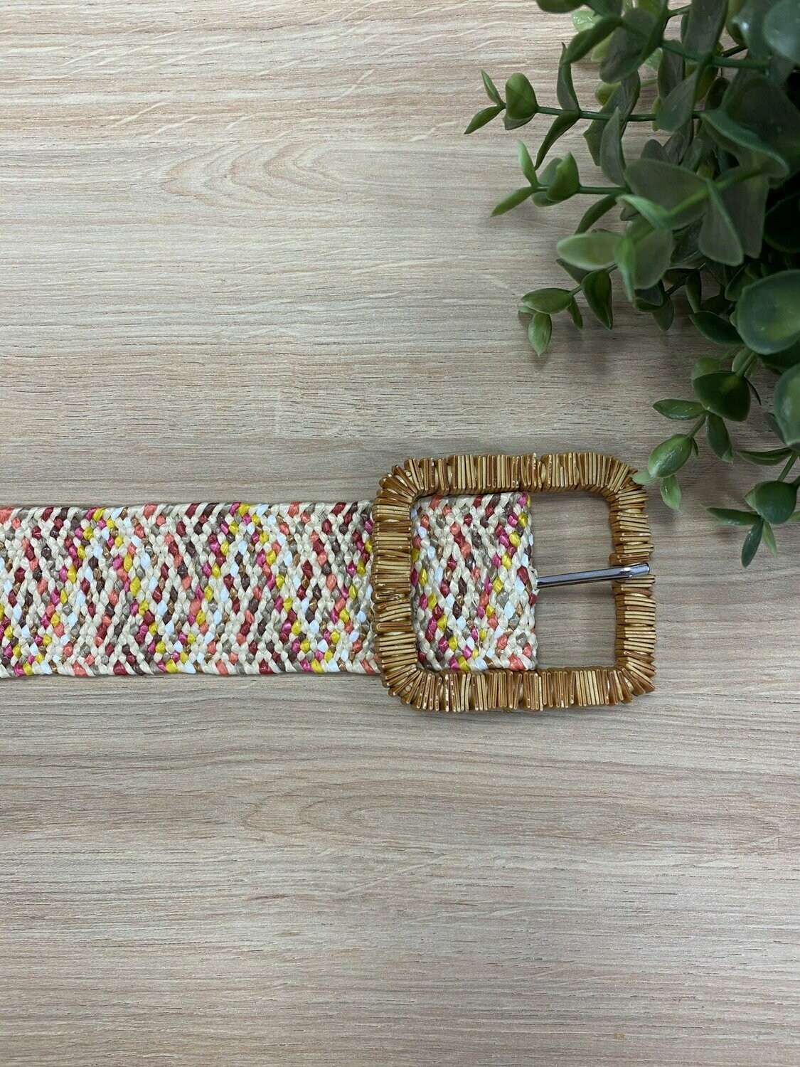 | Cinturón rafia colores. Cinturón de rafia elástico de colores con hebilla estilo madera. |