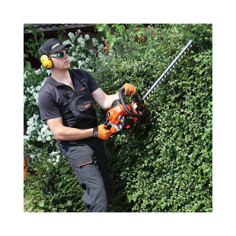 Calidad profesionalFabricado con la solidez y robustez que caracteriza a los productos ECHO, el cortasetos HCR 185 ES, por su potencia y comodidad, puede ser utilizado tanto por empresas de mantenimiento y jardineros, como usuarios particulares. Su motor diseñado y fabricado en Japón cumple con la segunda fase de la estricta directiva comunitaria de emisiones (EUST5), con menor consumo de carburante, bajo nivel de ruidos y menos emisiones de escape. Sistema de arranque asistido por muelle ES-Start que requiere el mínimo esfuerzo. El motor de arranque sólo requiere un corto tirón del cable. Mínimas vibracionesEl cortasetos ECHO HCR 185 ES ofrece un mínimo nivel de vibraciones, gracias a su tecnología integrada de bajas vibraciones que reduce enormemente la fatiga del usuario, permitiendo que la tarea de cortar los setos sea mucho menos cansada, sea cual sea la cantidad de setos a recortar. Uso confortable y sin fatiga, incluso para largas jornadas de trabajo. Fácil utilización y mantenimientoCon empuñadura giratoria con cinco posiciones diferentes que permite ajustarlo en un ángulo de 180 grados, para un uso mucho más confortable y una máxima maniobrabilidad, gracias a que gira el manillar, no toda la máquina. Como medida de seguridad, el acelerador se desconecta hasta que el manillar no se bloquea en una posición de trabajo determinada. El cortasetos ECHO HCR 185 ES es de fácil mantenimiento, ya que presenta un fácil acceso a las partes clave de la máquina. Permite un fácil acceso al filtro de aire sin necesidad de herramientas, incluso llevando guantes. Cuida al usuario y al setoEficaz sistema de refrigeración mediante el cual el aire es empujado hacia el seto, evitando la acumulación de suciedad en el motor. Este sistema de escape superior, con carcasa envolvente, protege al usuario y a cualquier persona que se acerque a la máquina de cualquier quemadura que pueda producirse al tocar el escape caliente. Las emisiones de gases son direccionadas lejos del usuario, con lo que también se previene el calentamiento y la decoloración de la planta. Incorpora funda protectora de la cuchilla, que previene al usuario de posibles accidentes por contacto con la cuchilla. La mejor calidad de corteEl cortasetos ECHO HCR 185 ES incorpora doble cuchilla cortada con láser y con afilado de precisión, mucho más duradero, que ejecuta un corte mucho más limpio. Con cuchillas autoafilables gracias a la acción de los dientes. El paso de cuchilla de 35mm permite trabajar en las mejores condiciones con distintos tipos de setos. Ofrece corte japonés ajustable, para un corte mucho más eficiente y duradero. Nuevo ángulo del bastidor que permite un corte perfectamente alineado con el seto y mejor acabado, disminuyendo también la fatiga del usuario. |
