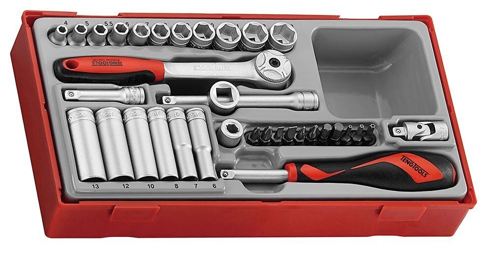| Juego de Vasos Hexagonales 1/4” modelo TT1435 de Tengtools presentados en bandeja modular. Contiene: 2 Alargaderas Ampliador 3/8”-1/4” Articulación universal Destornillador portavasos ¼” Llave de Carraca Puntas agujeros hexagonales. 5-6 mm Puntas Phillips PH1-2 Puntas Pozidriv PZ1-2 Puntas ranuradas 0.8x4-1.2x5.5 mm Puntas TX TPX10-15-20 Vasos serie larga 6-7-8-10-12-13 mm Vasos serie regular 4-5-5.5-6-7-8-9-10-11-12-13 |