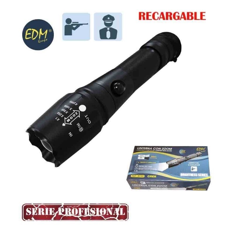 | Linterna táctica recargable con zoom 1 super led cree 10 w 800 lumens tiempo aproximado de carga 5 horas tiempo aproximado de funcionamiento 3 horas 3 intensidades de luz, destellos codigo morse de salvamento alcance: 500 metros aprox. incluye pila recargable y cargador ideal para pesca, caza, vigilantes seguridad, policia, actividades nocturnas. xml-t6 medidas: diametro 3,5cmx17cm |