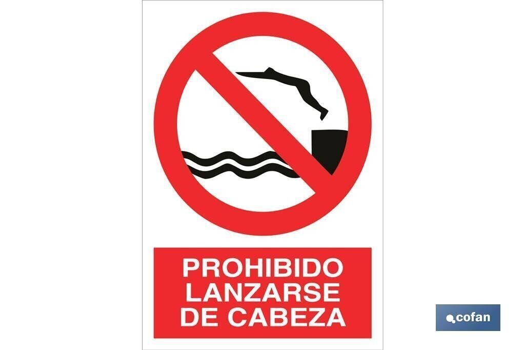 | Señal Pictograma y Texto "prohibido lanzarse de cabeza" en varias medidas y materiales. 1ud |