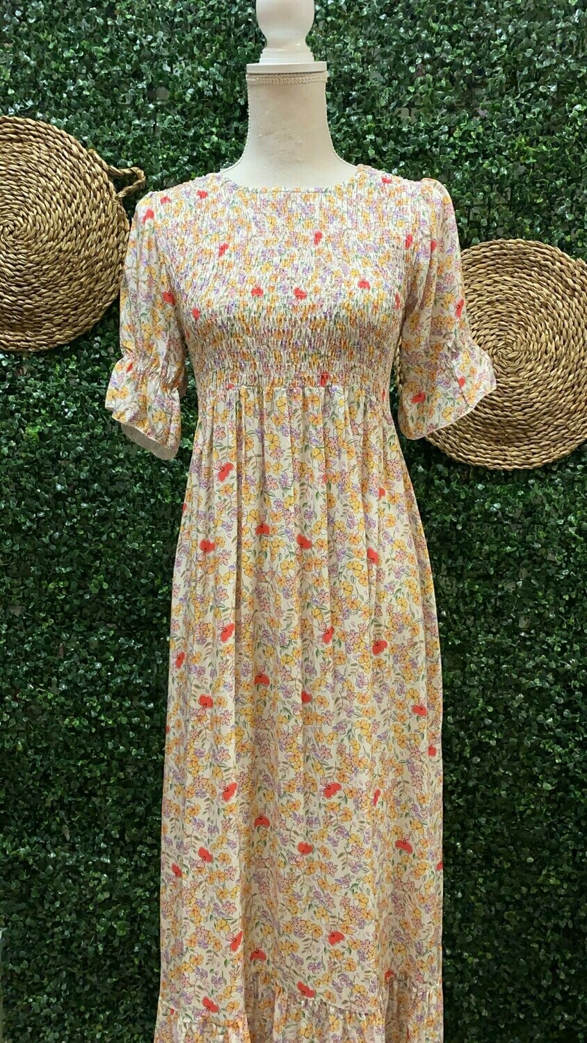 | Vestido Sofía. Vestido largo con estampado de flores, con panel de abeja en la parte superior y mangas cortas con volante. Talla única (36-42) |