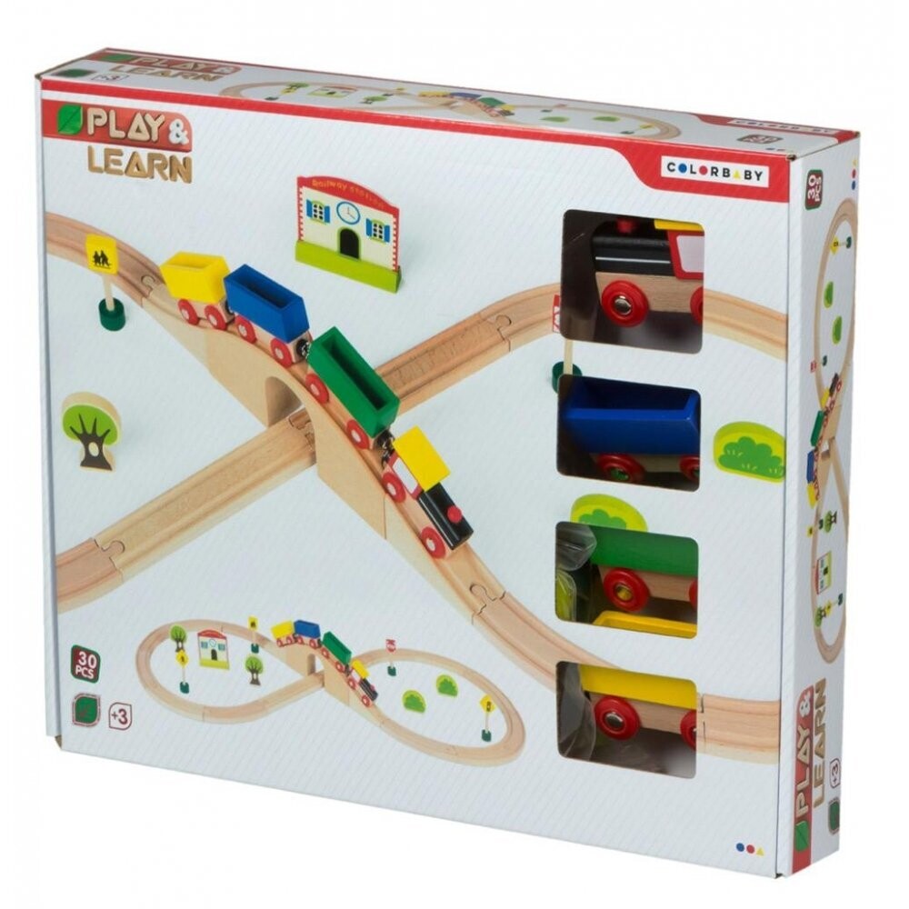 | Tren-Circuito de madera compuesto por 30 piezas de colores con las que los más pequeños a partir de 3 años disfrutarán montando las vías, los vagones con locomotora, etc. |