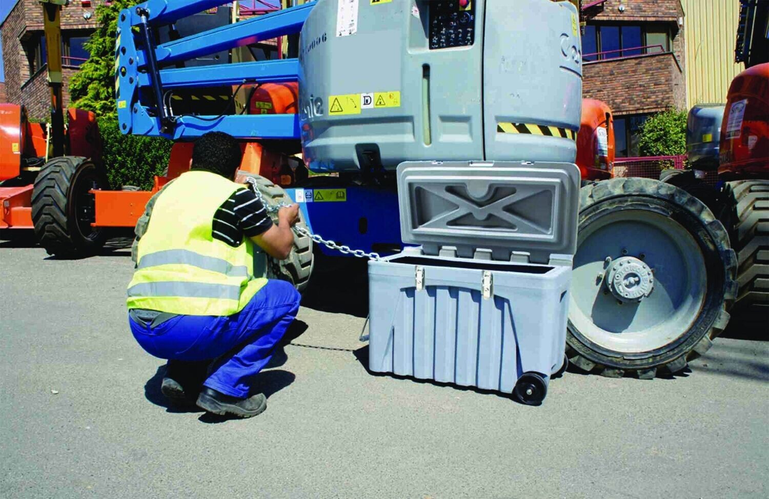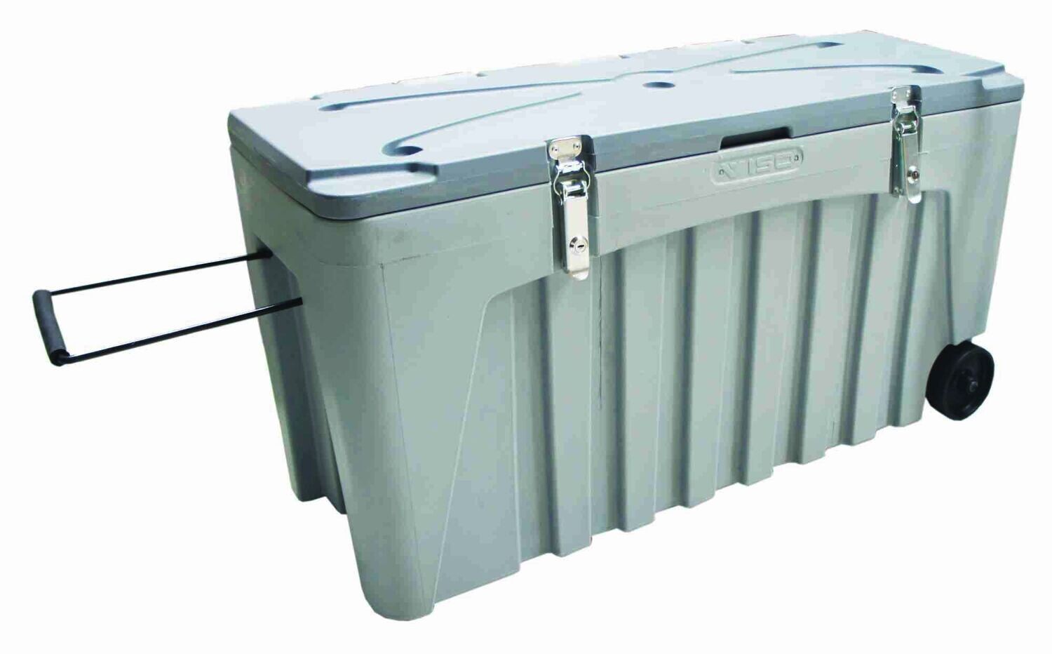 | La Caja de Almacenamiento con Ruedas modelo KOFPRO 1041 de Metalworks es un tipo de cofre hecho de polietileno, adecuado para uso industrial, con una capacidad de carga máxima de entre 105 y 150 kg.