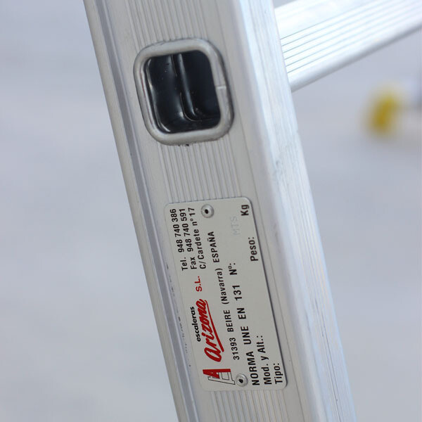 | El modelo A1 es una escalera de aluminio de un tramo que se utiliza en apoyo. Los peldaños son de 30 mm. de huella, con superficie antideslizante. El paso entre peldaños es de 28 cm. Escalera equipada con tacos antideslizantes, que permiten un apoyo seguro a la pared y al suelo, limitando la posibilidad de deslizamiento de la escalera. Peso máximo 150 Kg. Garantía de 5 años. Fabricada en conformidad con la norma UNE-EN 131 de Escaleras. |