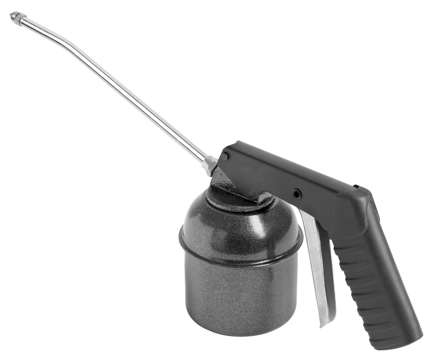 | Aceitera para uso industrial construida íntegramente en metal. Cuerpo de bomba con mecanismo de doble válvula de alta presión (40 bar) y filtro de aspiración. Accionamiento mediante gatillo acoplado a empuñadura ergonómica de tipo pistola. Salida rígida acodada de 200 mm con boquilla. Modelo de depósito de 300 g. |