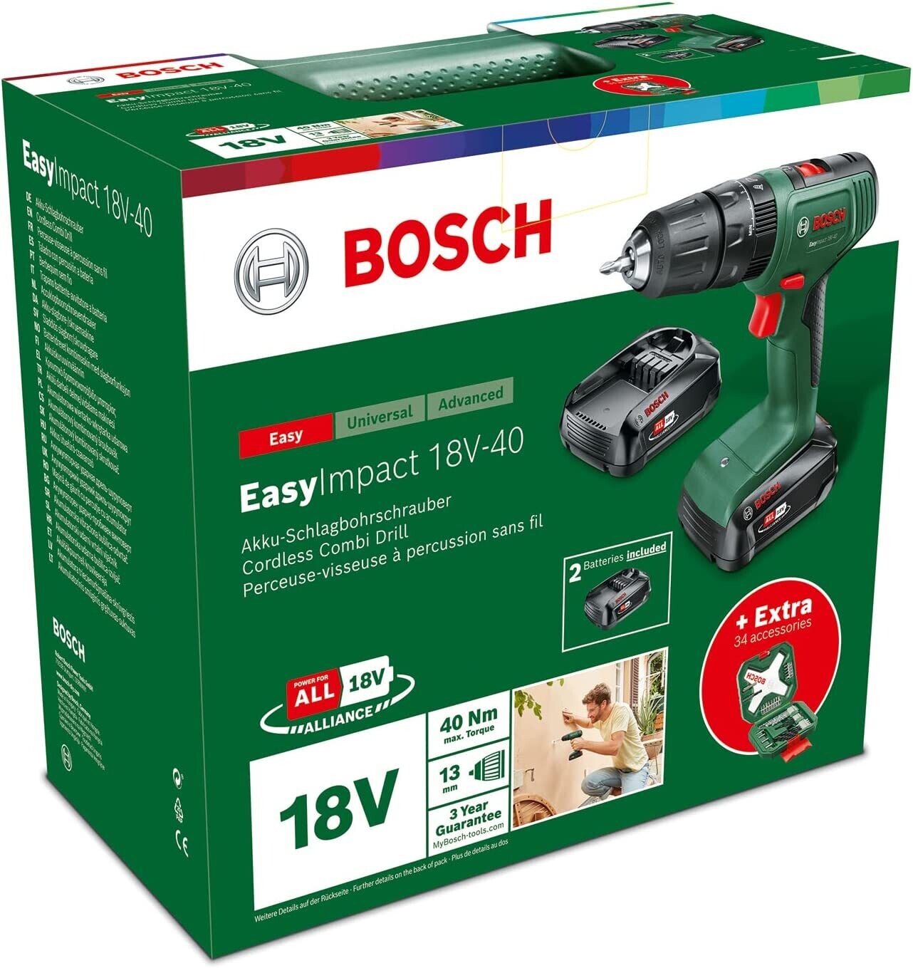 Bosch Home and Garden taladro percutor a batería EasyImpact 18V-40 (2x batería de 2,0 Ah, sistema de 18 V, set de destornilladores y brocas para madera, piedra y metal de 34 piezas, en caja)