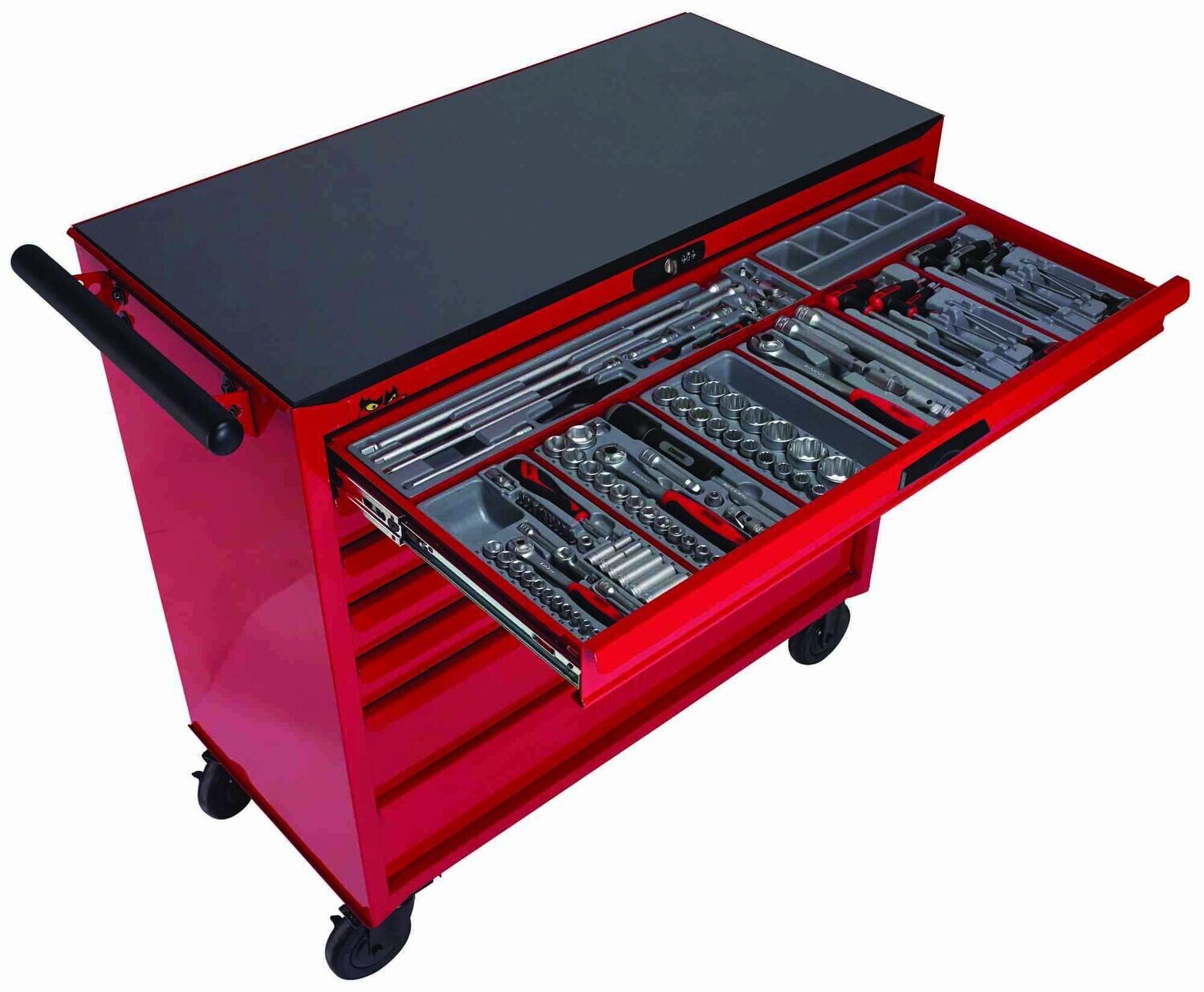 | El Kit para Taller TCMM622N de Tengtools esta formado por un carro móvil con 622 herramientas. Con garantía de por vida. Este carro es un 50% más ancho que los carros estándar y está formado por 7 cajones: 5 del mismo tamaño, 1 mediano y 1 grande. Características: