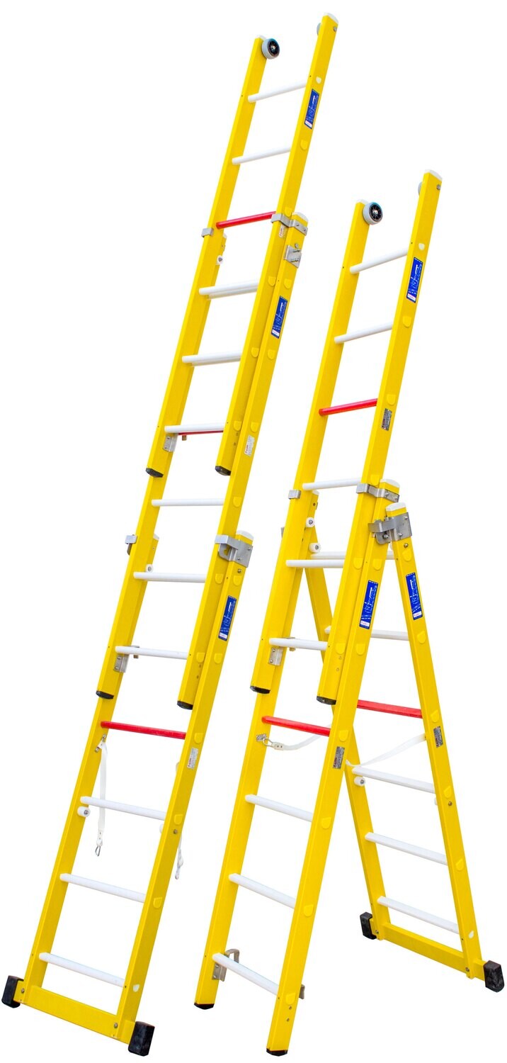 Escalera de Fibra Combinada de 3 Tramos Modelo FC7308 24 Peldaños Altura en tijera 2445 mm Altura en tijera + tramo 4105 mm Altura extendida 5795 escalera Ancho escalera 514 Base 824 Peso 29 kg