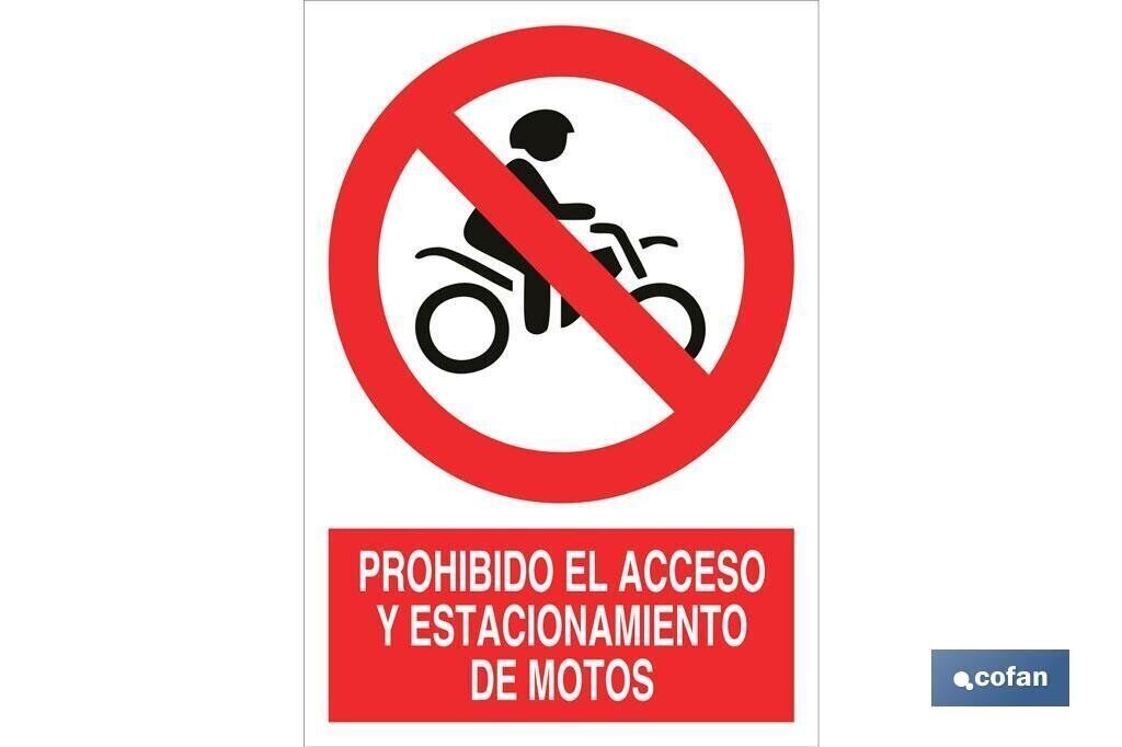 | Señal Pictograma y Texto "prohibido acceso de motos" en varias medidas y materiales. 1ud |