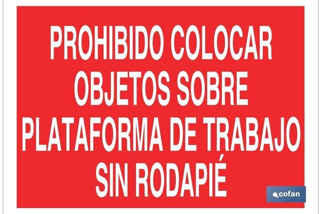 | Señal de prohibición, con texto, prohibido colocar objetos sobre plataforma de trabajo sin rodapié. 1ud |