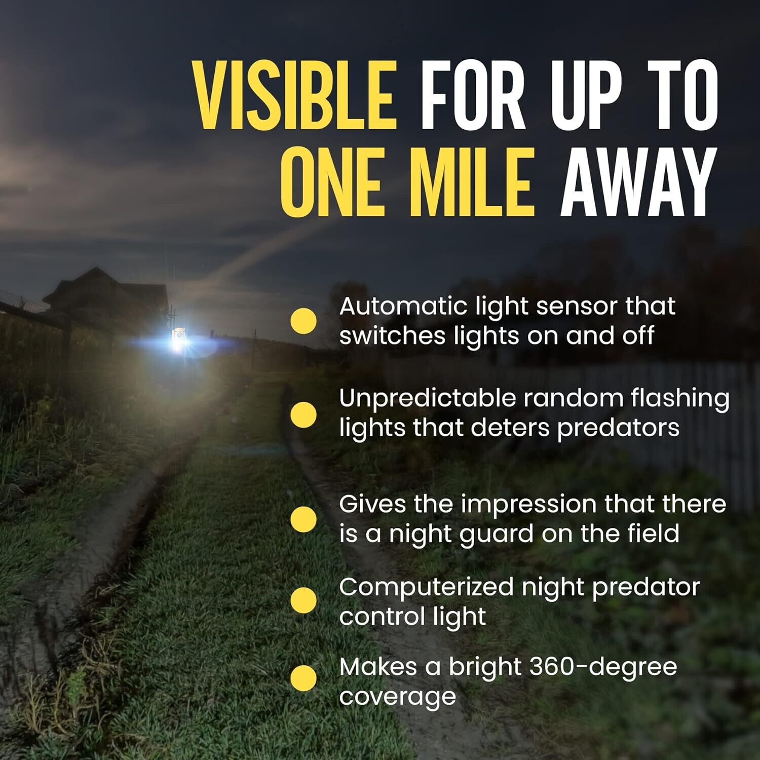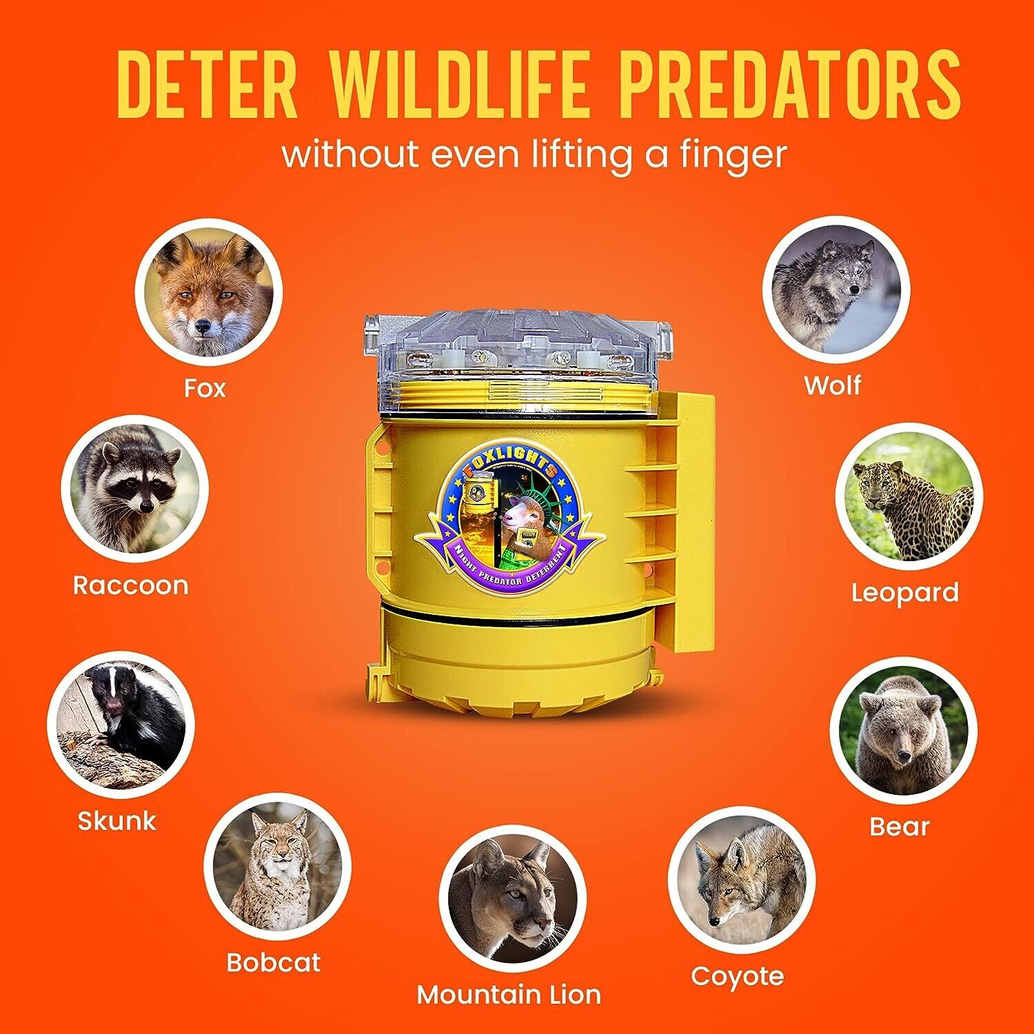 | El dispositivo Foxlight es el método para ahuyentar zorros, lobos y jabalís de granjas, cultivos o explotaciones ganaderas. Foxlights lleva incorporadas 9 bombillas LED de gran potencia y 2 colores diferentes orientadas en distintas direcciones que se activan en la oscuridad de forma automática mediante un sensor de luz , causando la impresión de que alguien podría estar patrullando la zona con una linterna. Para crear esta ilusión tiene un microprocesador controla un flash aleatorio y variable. Un sensor de luz activa el flash de 9 bombillas LED entre el anochecer y el amanecer de forma automática (no tiene interruptor de encendido/apagado). Es decir, esta apagado de día y se enciende de noche, de forma automática. Foxlights esta alimentado por una batería de 6 voltios (no incluida). Cuando la batería esta baja, las luces se desvanecen antes de apagarse completamente. Los depredadores asocian esa luz a la presencia humana y huyen. Visibilidad a 1 kilómetro y visión de 360º Resistente a la intemperie y altas o bajas temperaturas. El diseño de Foxlight permite clavar o fijar el dispositivo en una estaca, árbol o valla No perjudica al ganado ni a animales doméstico *Puede comprar la pila para el producto