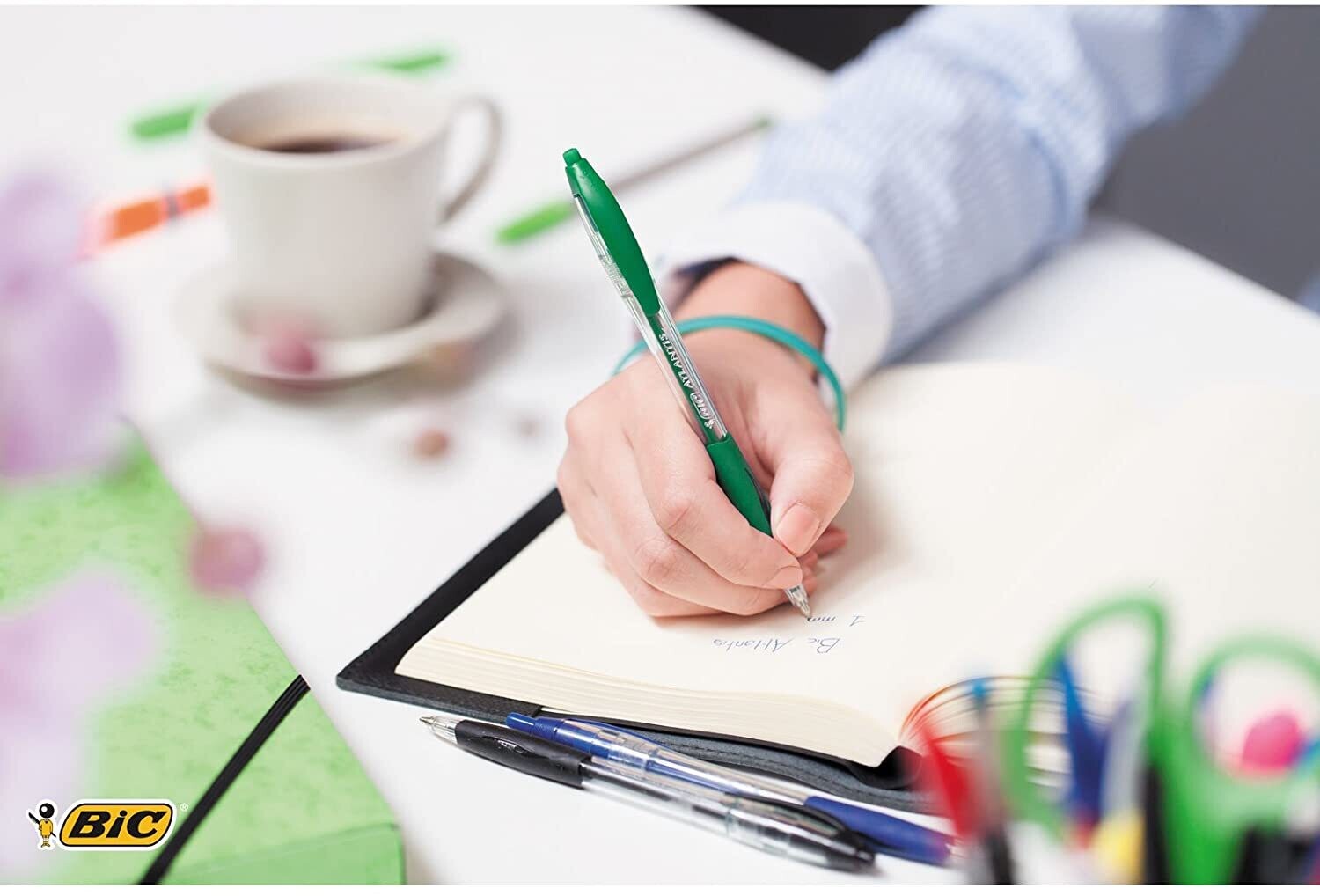 BIC® 4 Colours™ Fluo Bolígrafo retráctil con punta de bola, punta media de 1 mm, cuerpo blanco y verde, colores de tinta variados: Azul, amarillo, rojo y negro