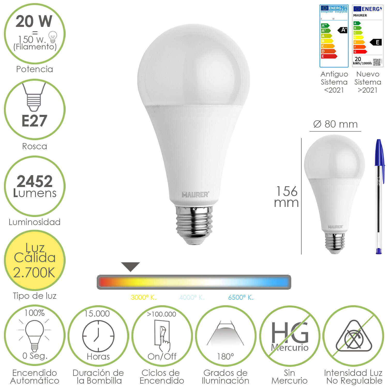 Bombilla Led Estándar Rosca E27. 20 Watt. Equivale A 150 Watt. 2452 Lúmenes. Luz Cálida (3000 K.)