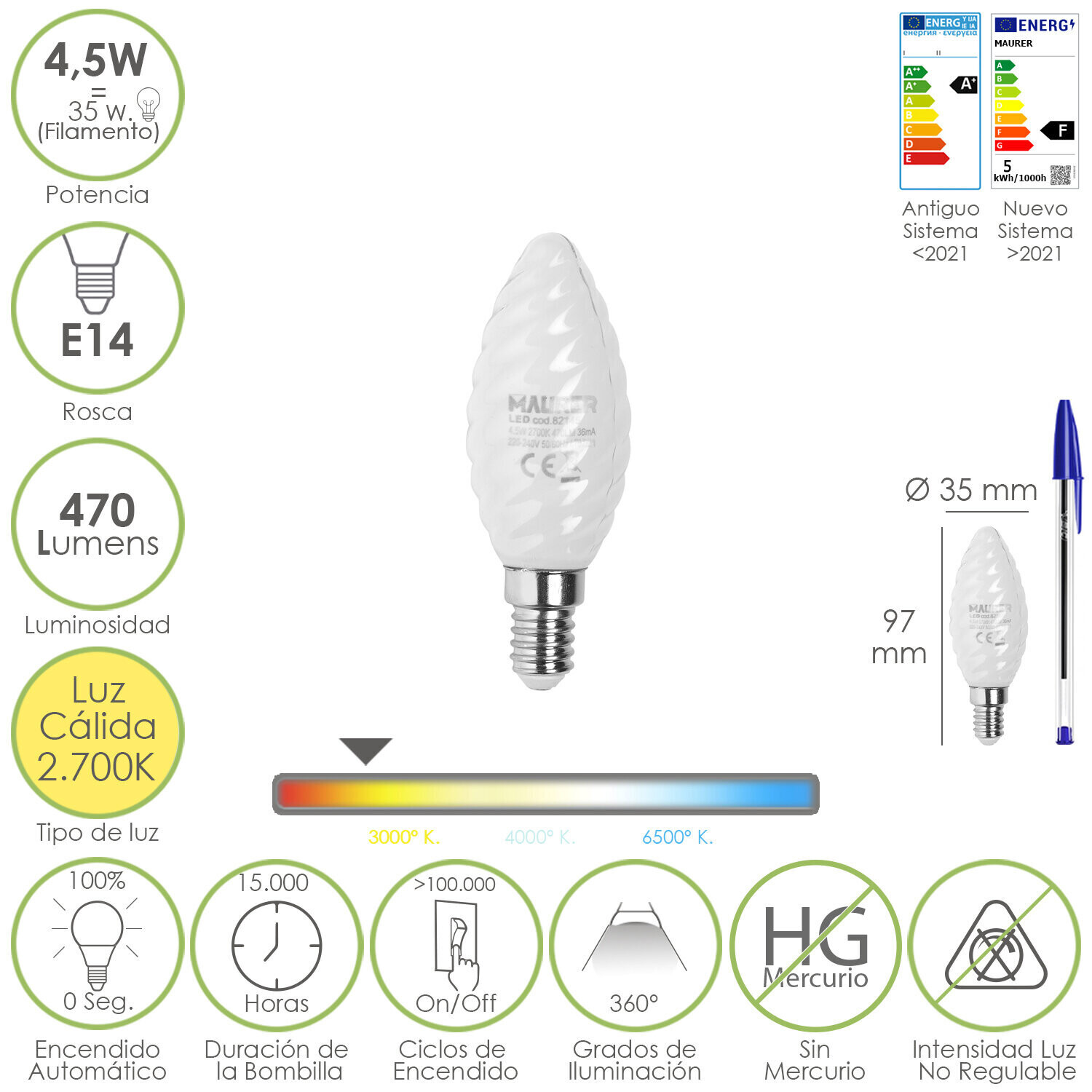 | Bombilla Led Filamento Vela Esmerilada E14. 4,5 Watt. Equivale A 35 Watt. 470 Lúmenes. Luz Cálida 2700 K. |