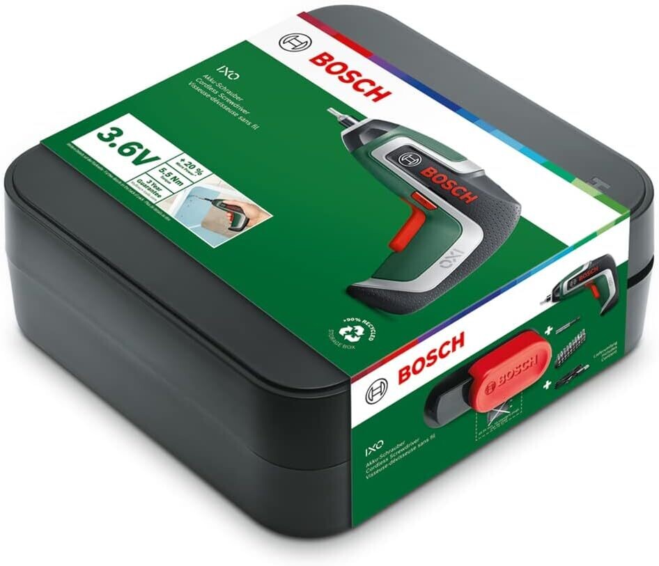 Bosch Home and Garden 06039A800U Bosch Atornillador IXO(5.ª generación, batería integrada de 3,6 V, Accesorio de par de Giro, 10 Brocas, Cargador USB, en Caja de carton)