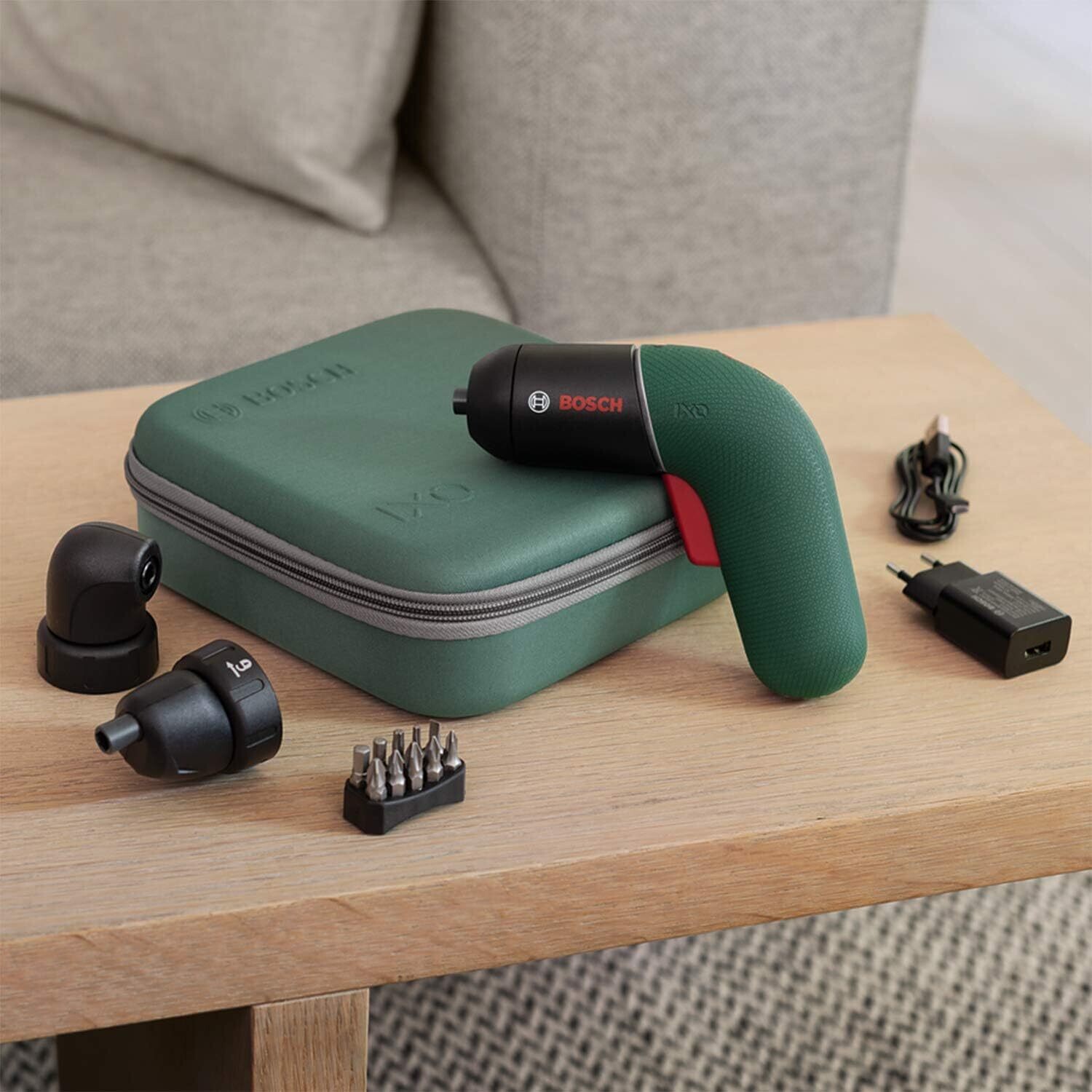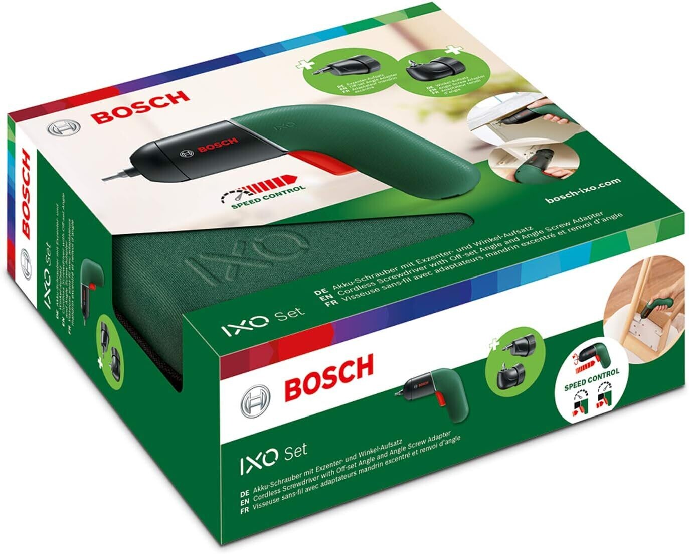 Bosch atornillador a batería IXO Set 6a generación, verde, con adaptadores angular y excéntrico IXO, CONTROL DE VELOCIDAD variable, recargable con cable micro-USB, en maletín blando