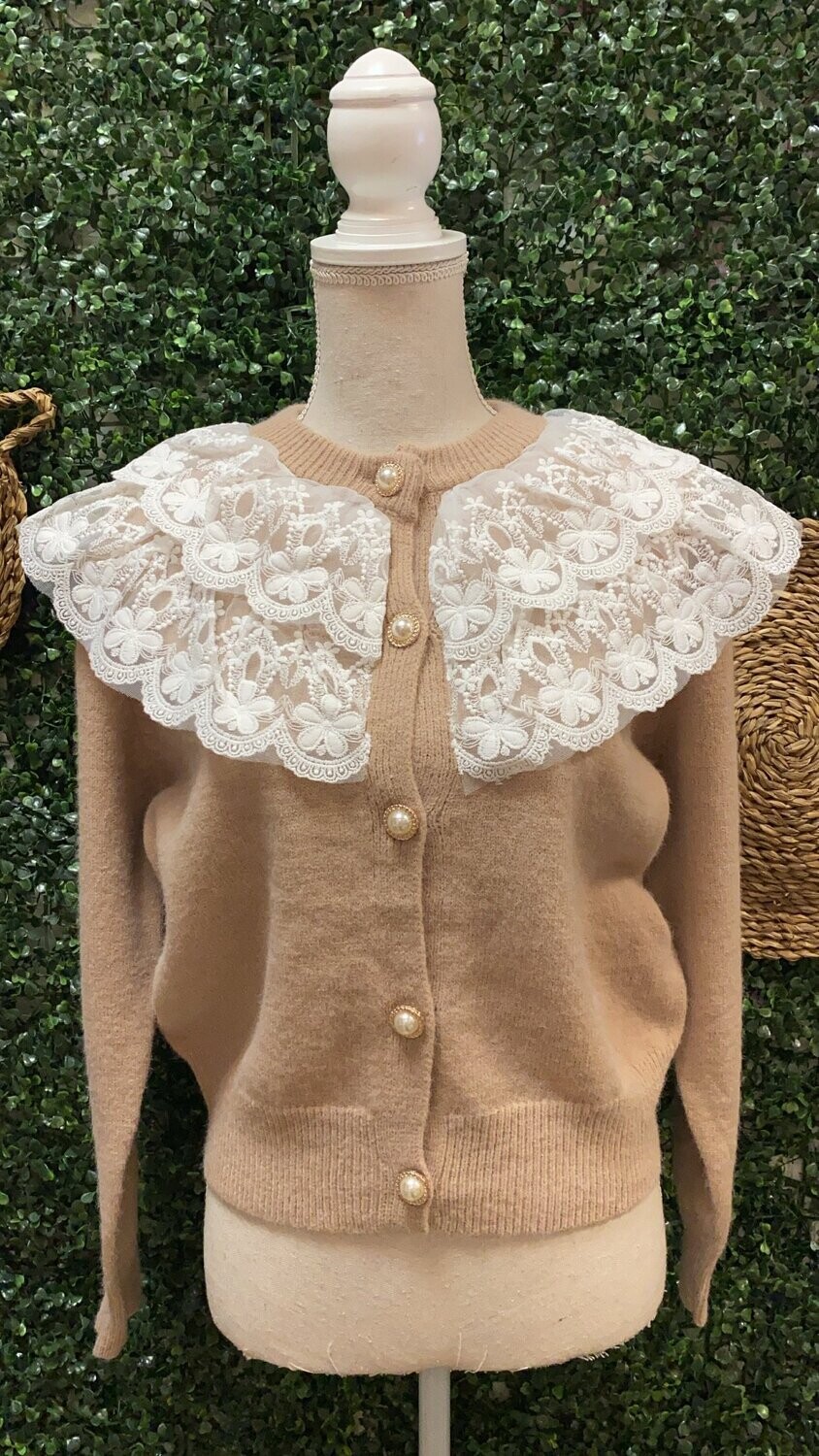 | Cárdigan corto Julia. Cárdigan corto en color café con detalle de babero en puntilla blanca y botón perlado. Talla única (36-42) |