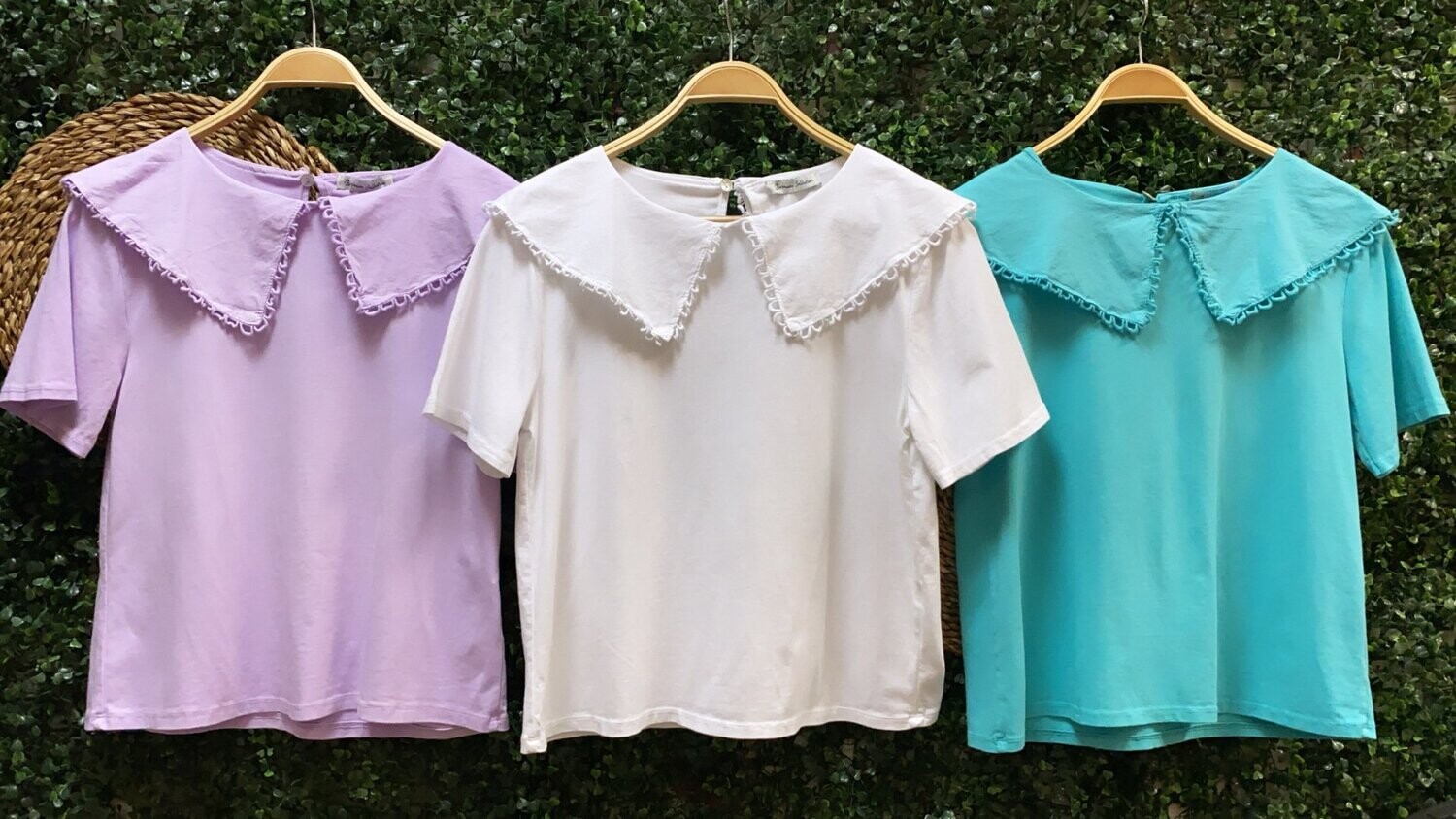 | Camiseta Sara. Camiseta de manga corta de algodón con detalle de cuello bebe en camisa con bordado. Colores: Blanca, azul y lila. Talla única (36-40) |