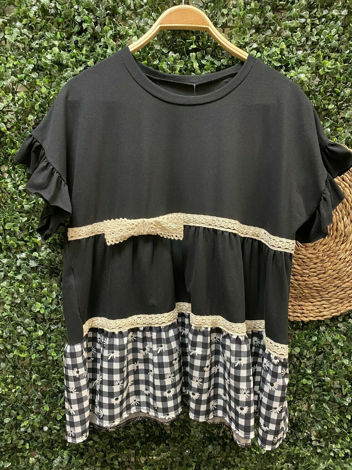 | Camiseta Véronica. Camiseta con detalle en vichy y lazo en croché. Ideal con pantalón negro o blanco. Talla única |