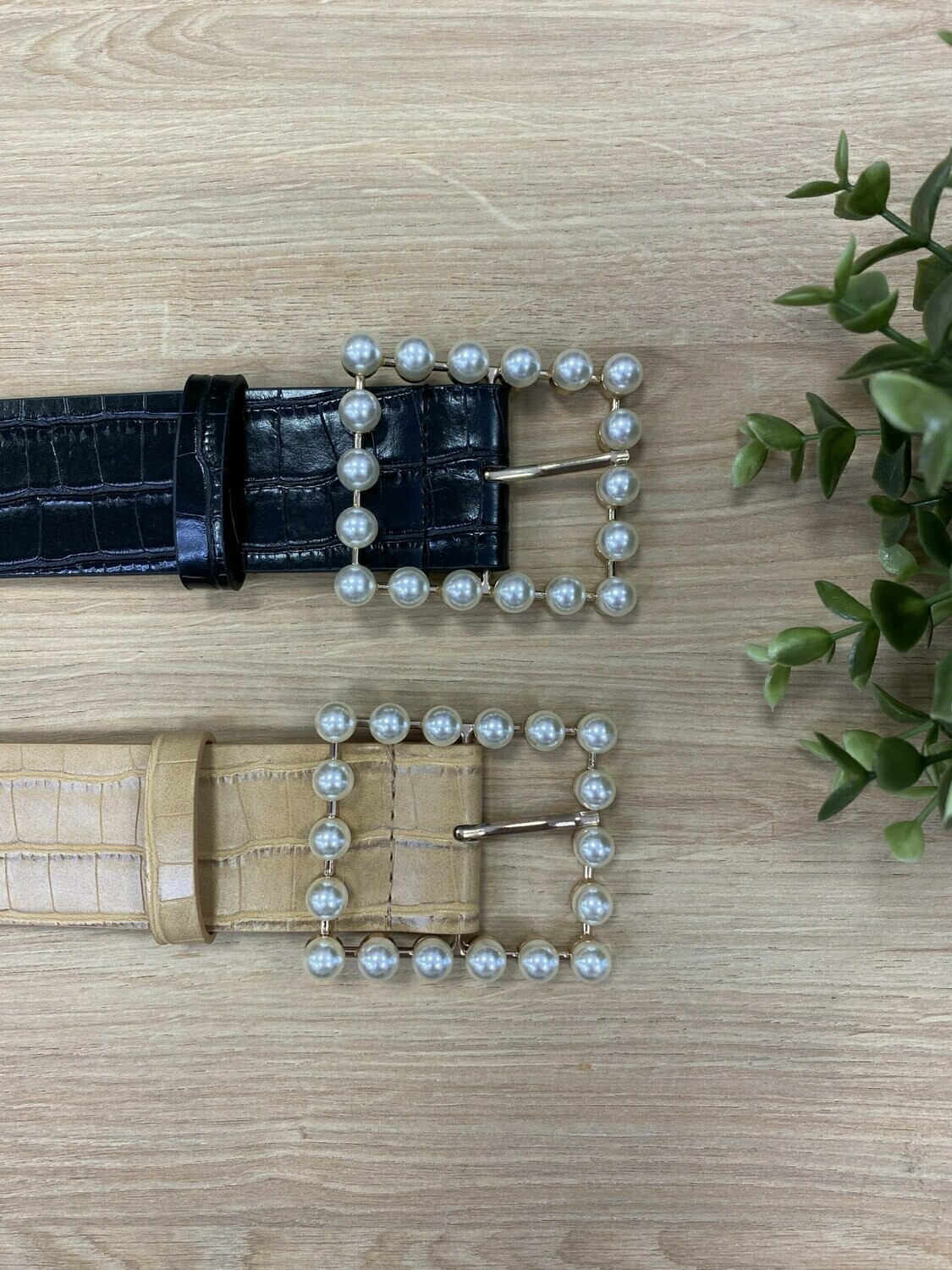 | Cinturón Perlas. Cinturón en color negro o beige símil serpiente, con detalle de hebilla en perlas. |