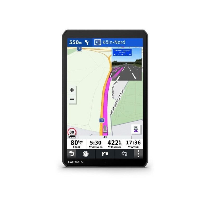 | dēzl™ LGV800 es el navegador de 8 pulgadas de fácil lectura que ofrece a los profesionales de la carretera una idea del trayecto que queda por recorrer gracias a las rutas personalizadas1, según el tamaño y el peso de tu camión. Mantente al día de todo. La gran pantalla táctil de 8 pulgadas puede montarse en modo horizontal o vertical. Consigue la ruta óptima para tu vehículo con las rutas personalizadas para camiones1, además de las alertas útiles que te informarán de datos como próximas pendientes pronunciadas. ¿Necesitas descansar un rato? Los datos de Truck Parking Europe se mostrarán a lo largo de tu trayecto. ¿Necesitas una ducha? ¿Repostar? Utiliza la base de datos de servicios para caminos y tráileres. Encuentra zonas de carga o espacios de almacenamiento locales gracias a las mejores indicaciones a zonas de carga del sector. Comando de voz. Disfruta de la comodidad que te ofrece el asistente de voz y la función de manos libres2. |