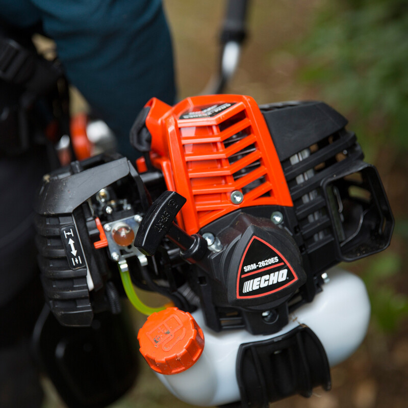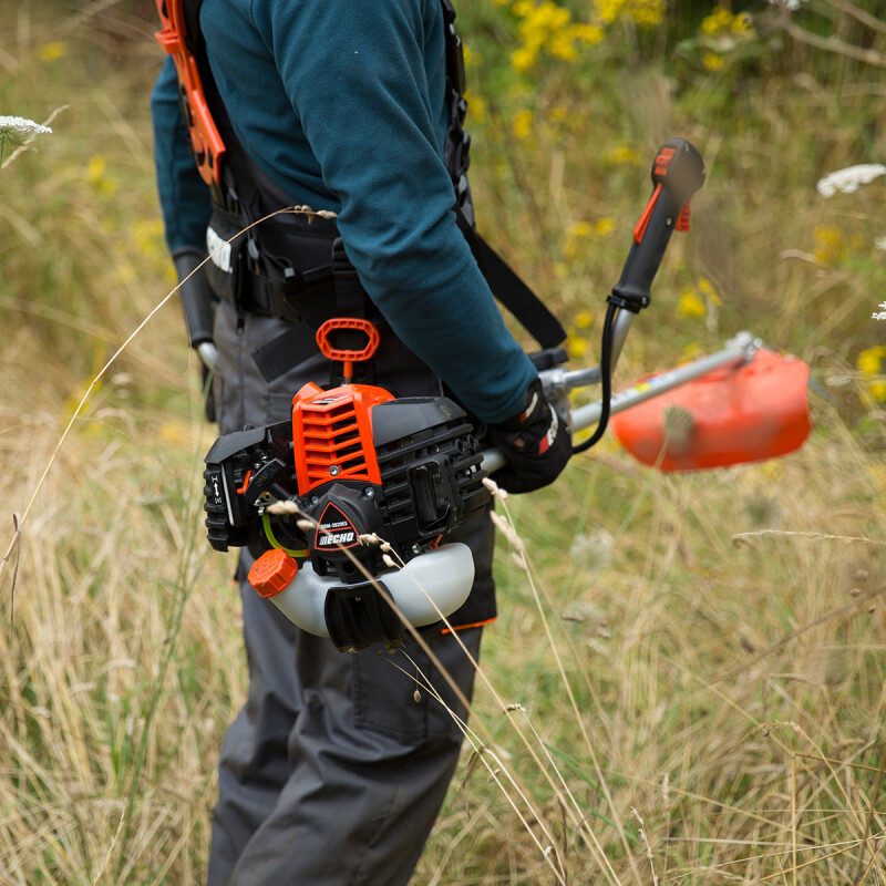 La desbrozadora más ligeraLa desbrozadora ECHO SRM 2621 ESU, ligera, robusta y compacta, es el modelo más potente de su categoría. Su nuevo motor con catalizador, que reduce las emisiones de CO2, y de alto rendimiento la convierte en la desbrozadora profesional ligera más potente del mercado. El exclusivo sistema de arranque fácil ES-Start permite un rápido encendido con el mínimo esfuerzo. Potencia y tecnologíaSu motor de alta resistencia presenta un menor desgaste, lo que significa una mayor vida útil del mismo y durabilidad extendida. Su motor diseñado y fabricado en Japón cumple con la segunda fase de la estricta directiva comunitaria de emisiones (EUST5), con menor consumo de carburante, bajo nivel de ruidos y menos emisiones de escape. Su sistema de encendido electrónico CDI mejora el comportamiento de la máquina a cualquier régimen del motor y se ajusta perfectamente a cada condición de trabajo. Comodidad de usoDisfruta de bajo nivel sonoro y tecnología integrada de bajas vibraciones, gracias al motor montado sobre silent-blocks, lo que la convierte en un modelo muy cómodo para trabajar durante largas jornadas. Se mantiene dentro de los niveles de vibraciones establecidos por la Directiva 2002/44/CE, siendo así un modelo muy atractivo para las autoridades locales y los grandes contratistas. Destaca su peso reducido, para menor fatiga del usuario. La importancia de los detallesFiltro de aire de papel de alto rendimiento de fácil limpieza y con prefiltro de esponja, de fácil acceso sin necesidad de usar herramientas, que permite intervalos de mantenimiento más largos y sencillos. Los cables de encendido están protegidos gracias al nuevo diseño de la cubierta del motor, evitando así averías. La maneta está montada sobre silent-blocks, reduciendo drásticamente las vibraciones y la fatiga del usuario. Prestaciones mejoradasLa desbrozadora ligera SRM 2621 ESU incorpora una serie de mejoras respecto a su modelo predecesor que han mejorado su usabilidad, seguridad y rendimiento. El nuevo diseño del protector de la cuchilla mejora la visibilidad de corte y evita los enredos de la hierba en el cabezal, así como su desgaste. El lado izquierdo del manillar se ha modificado para evitar el contacto de la rodilla con el mismo, mejorando así el manejo de la máquina, así como el ajuste para cambiar fácilmente al modo transporte. El enganche al arnés también se ha mejorado, para un ajuste de la máquina más fácil y seguro. Con el mejor equipamientoLa desbrozadora ECHO SRM 2621 ESU de manillar simple es adecuada para trabajar con hilo de nailon. Se entrega con un cabezal semiautomático SF400, protector multifunción y arnés estándar, para que puedas disfrutar del trabajo cómodamente y bien protegido. Todo está pensado para la máxima seguridad del usuario. |
