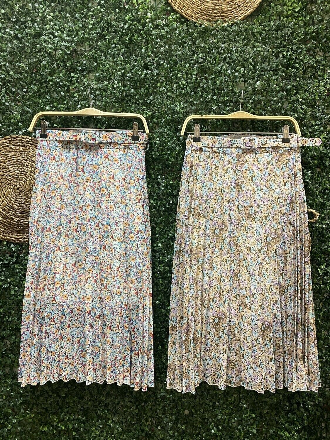 | Falda Capri. Falda midi de tablas, con estampado de flores y cinturón a juego. Color: Lila y azul. |