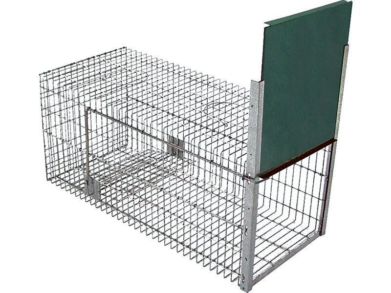 Jaula con una puerta de entrada. Se acciona por pisada del animal. Medidas: largo 61 cm, ancho 39 cm, alto 38 cm.