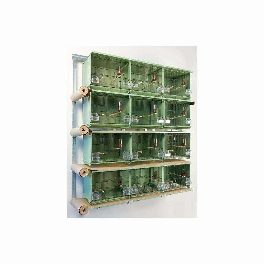 | En precio de las jaulas se completa con: – Estructura de pared Medidas cada jaula: 45X30X36H cm Modulo: 12 jaulas, 4 altura, 3 columna Medidas modulo: largo.152 x ancho 38 x 168 Altura cm Fijación: Estructura para pared Sistema: Rollos Papel Color: Verde |