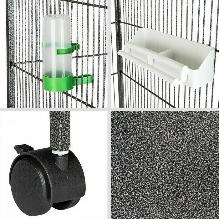 • Cuadrada • Comedero grande con percha • 2 puertas de apertura vertical, una pequeña y una grande • 4 perchas ajustables individualmente • Bandeja extraíble para el cambio de arena • Rejilla en el suelo (la pajarera permanece cerrada al limpiar la bandeja) • Con ruedas para moverla fácilmente • Bebedero • Distancia entre barrotes pequeña para las crías • Acabado en color plata-antracita ► Detalles técnicos: • Altura total: 157 cm (inkl. tejado) • Medidas exterior jaula (alto x ancho x fondo): 119 x 52 x 52 cm • Medidas exterior tejado (ancho x fondo): 65 x 66 cm • Medidas interior jaula (alto x ancho x fondo): 118 x 50 x 50 cm • Grosor rejilla: 2 mm • Distancia entre rejillas: 1,3 cm • Puerta grande (alto x ancho): 21 x 22,5 cm • Material: Acero con revestimiento de polvo • Puerta pequeña (alto x ancho): 21 x 12 cm • Peso: 16,6 kg ► Componentes del producto: • Pajarera • 4 ruedas • 4 perchas • Bandeja • Comedero • Bebedero • Manual de instrucciones |
