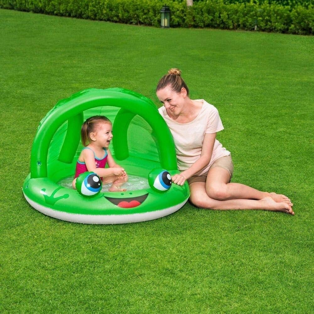 Piscina Bestway hinchable de rana color verde o mariquita color rojo, con cobertura. Esta piscina de juego es fácil de inflar, desinflar y almacenar. Surtidos. Medidas 97x66 cm.