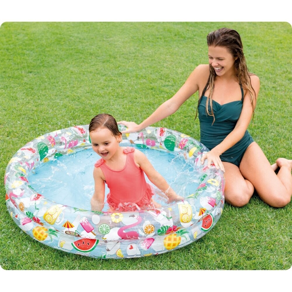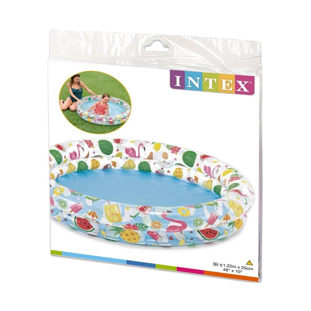 Intex piscina infantil hinchable de 122x25Cm, cuenta con dos aros, tiene capacidad para 150 litros e incluye parche de reparación. Se Presenta en tonos rosas decoradas con estampado tropical de frutas y flamencos en colores brillantes. Recomendado a partir de 2 años.