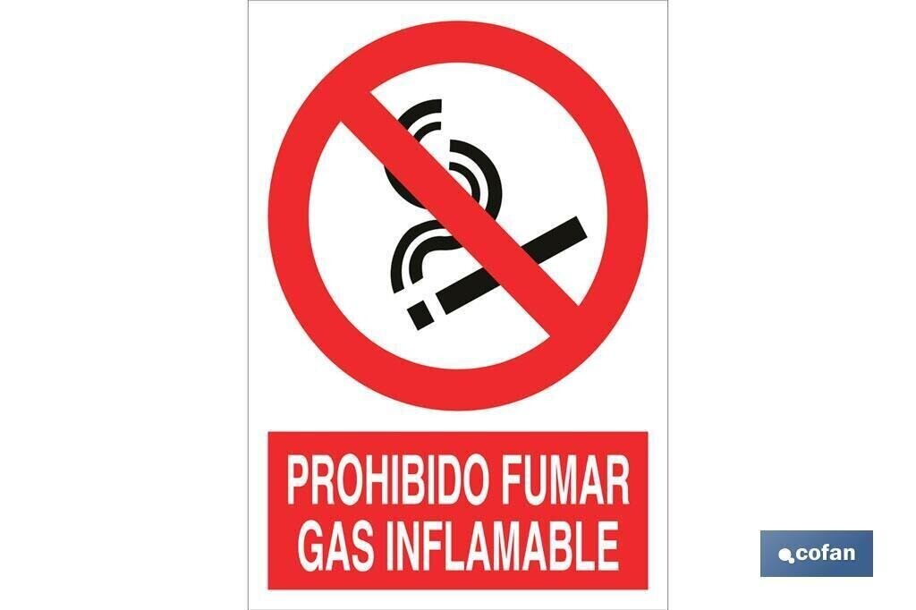 | Señal Pictograma y Texto "prohibido fumar gas inflamable" en varias medidas y materiales. 1ud |