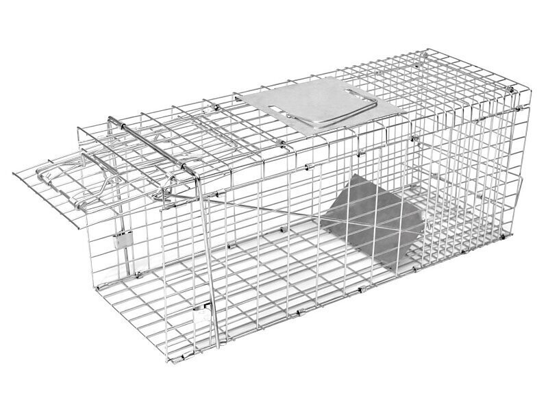 Trampa plegable. Fabricada con alambre galvanizado. Fácil de colocar y utilizar. Una puerta de captura con tabla de accionamiento y seguro integrado, asa plegable. Medidas: largo 60 cm, ancho 17 cm, alto 20 cm.