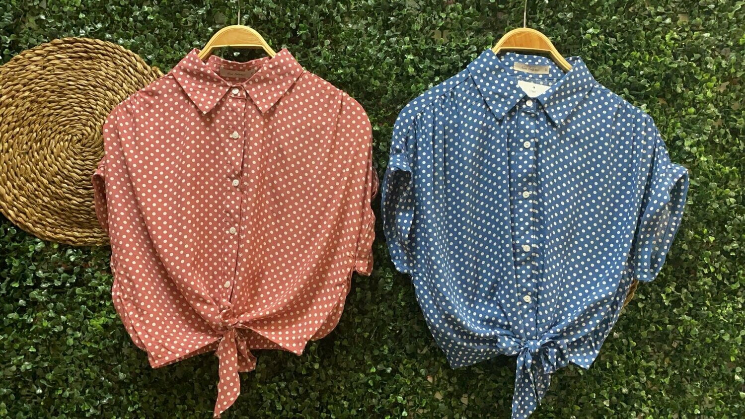 | Top Paula. Top de lunares en color rosa o azul, con detalle de nudo en la cintura. Talla única (36-40) |