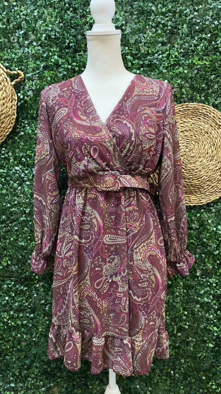 | Vestido Florencia. Vestido corto estampado en color azul o vino. Con cinturón a juego. Talla única (34-38) |