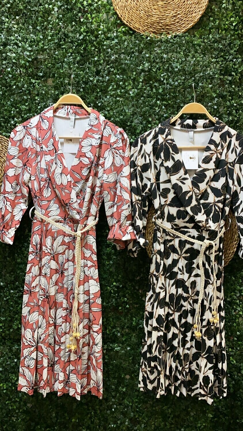 | Vestido Flori. Vestido con estampado de hojas y cinturón en color arena. Falda en tablas. Dos colores: Negro y rosa |